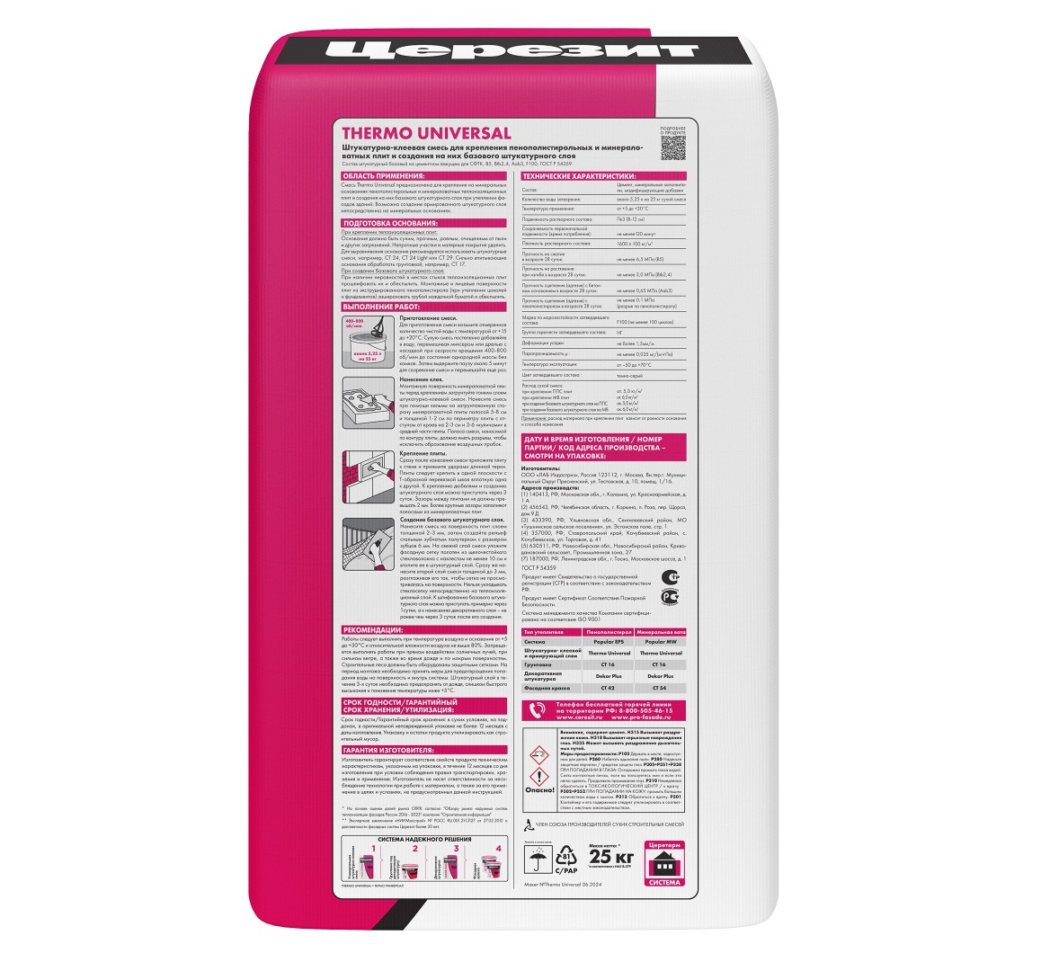 Описание товара: "Клей Ceresit Thermo Universal для пенополистирольных и минераловатных плит (25 кг)"